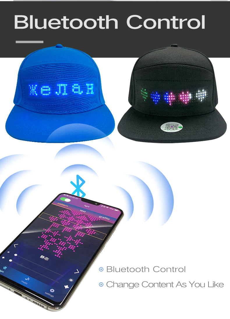 Stand out from the crowd with the Bluetooth LED Glow Cap, a fully customizable light-up hat controlled via a smartphone app. Whether at parties, concerts, sports events, or clubs, this cap lets you display any text, graphics, or animations to grab attention instantly.